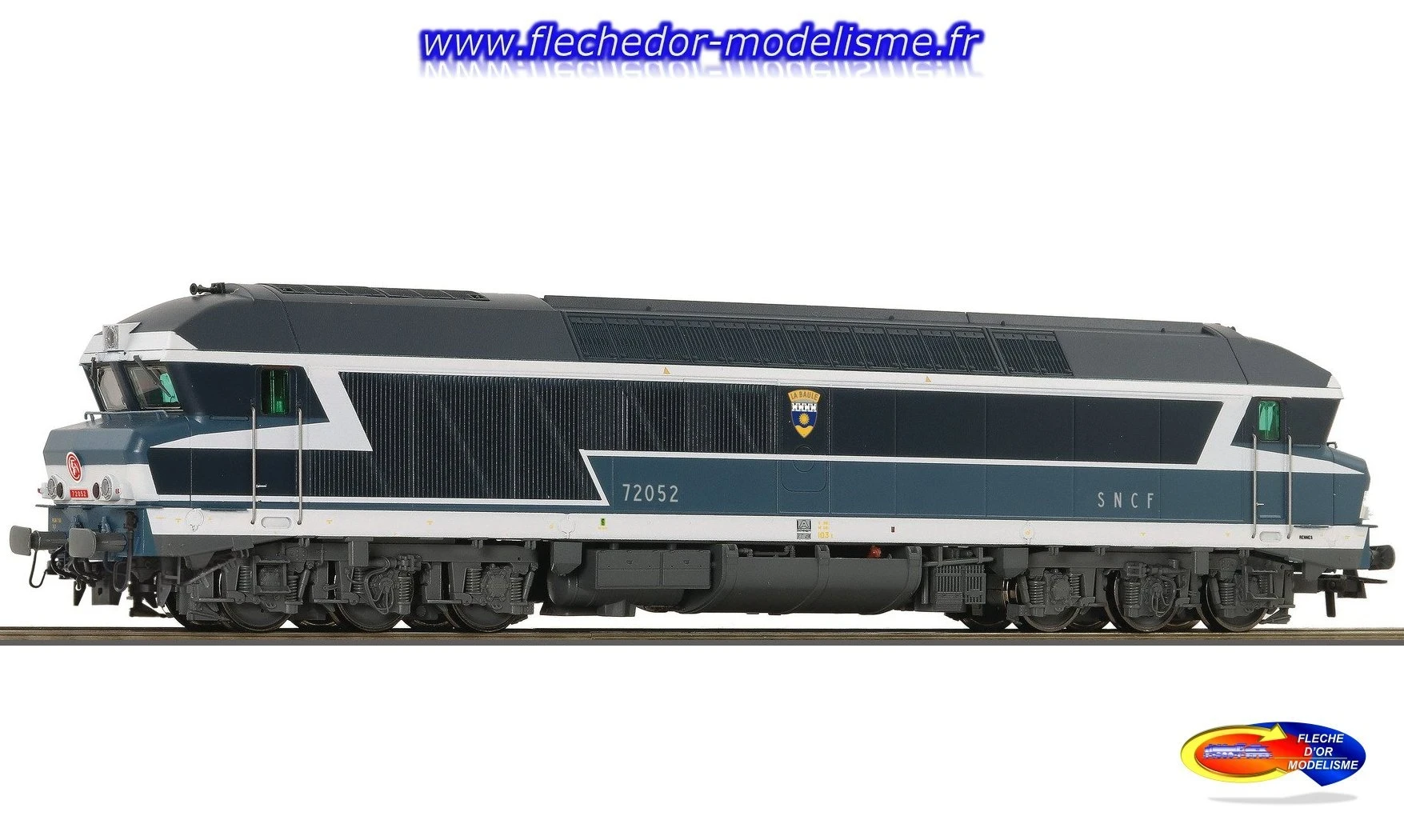 Locomotive diesel CC 72052, difitale/son, blason "La Baule", SNCF - Ep.IV - proposée pa ROCO. Boîtier d'attelage selon NEM 362 avec cinématique d'attelage court. Rayon minimal : 419 mm. Masse d’équilibrage. Nombre d’essieux entraînés : 6. Nombre d’essieux avec bandages d’adhérence : 1. Trois feux avant et deux feux de fin de convoi inversés en fonction du sens de marche. Fanal LED : Oui. Fonction d’éclairage supplémentaire. Lumière intérieure, LED : OUI. Commutation numérique, Lumière de la cabine de conduite. Interface électrique PluX22 pour unités de traction. Décodeur numérique PluX22. Son : Oui. Longueur tampons compris : 232 mm. Nombreuses pièces rapportées, dont certaines sont photogravées. Utilisation pour la traction des trains rapides sur des lignes principales non électrifiées. Avec ventilateurs commutables. En mode numérique, avec feux avant ou arrière et éclairage de la cabine de conduite commutables. Historique : Lors de ses débuts sur les rails en 1967, la CC 72000 était considérée comme la locomotive diesel la plus puissante de la SNCF. Grâce à sa motorisation diesel-électrique, cette série était adaptée aussi bien aux vitesses élevées qu'au transport de charges lourdes. Pendant plus de 40 ans, la SNCF a utilisé ces locomotives devant des trains rapides, par exemple entre Lyon et Marseille ou Paris et Bâle, et devant des trains de marchandises lourds.