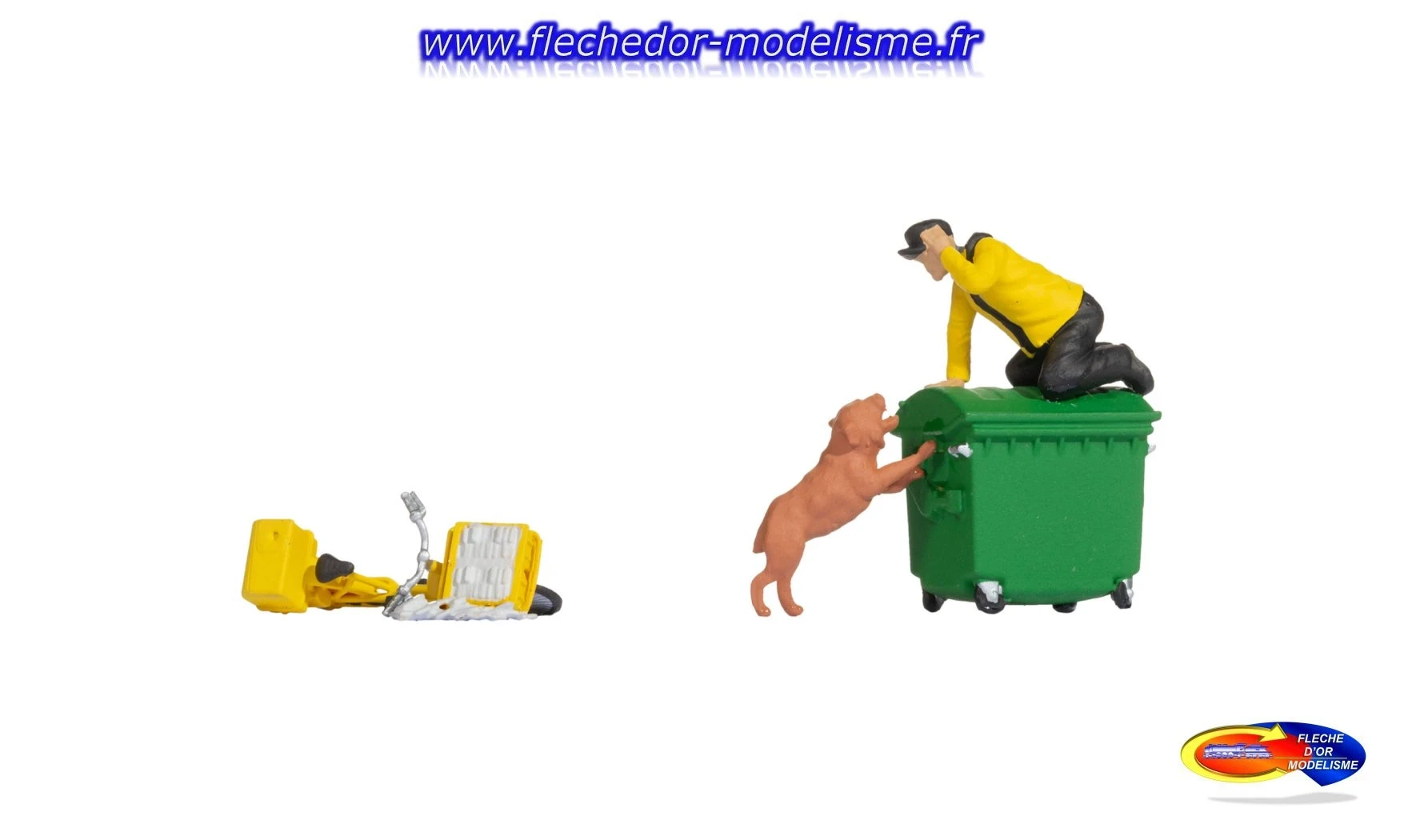 Scène drôle "Attention au chien" proposée par NOCH. Avec Funny-Scenes "Caution Dog", NOCH propose une scène vivante et humoristique qui ne manquera pas de faire sensation sur votre réseau de chemin de fer miniature ! Cette scène montre un homme qui est manifestement en train de fuir un chien vigilant. L'homme a précipitamment laissé tomber son vélo et a grimpé sur la poubelle par peur, tandis que le chien tente de l'atteindre en aboyant bruyamment et attentivement. Le vélo renversé se trouve à côté du conteneur, entouré d'ordures éparses, ce qui confère à la scène un dynamisme et une authenticité supplémentaires. Funny-Scenes "Caution Dog" est parfait pour les coins urbains, les arrière-cours ou les scènes de rues animées dans votre maquette de paysage. Cette représentation à la fois drôle et excitante apporte une pincée d'action et d'humour à votre maquette et ne manquera pas de faire sourire les spectateurs. NOCH est synonyme de figurines détaillées et pleines de caractère - découvrez ces scènes amusantes et bien d'autres encore sur NOCH.com !