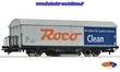 Wagon nettoyeur de rails sur base d’un wagon couvert avec plateforme de frein, proposé par ROCO. Longueur tampons compris : 168 mm.