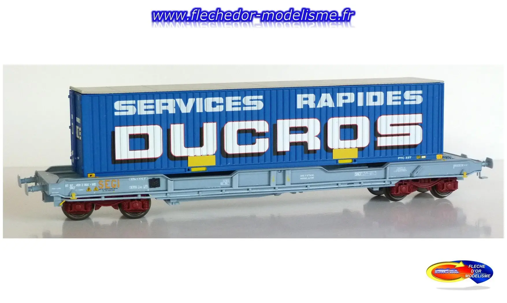 Wagon porte-conteneurs Novatrans type KMr, gris bleu, grand logo SEGI, caisse mobile 40' crênelée "DUCROS" bleue, n° 83 87 459 2 064-8 - Ep.IV-V - proposé par LS-Models. Attelages NEM à élongation. Wagon parfaitement lesté produisant un excellent roulement !