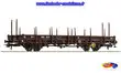 Wagon plat à ranchers à essieux - Ep.IV-V - SNCF, nouvelle immatriculation, proposé par ROCO. Attelages NEM à élongation. Plaques et ranchers fournis. Belle finesse de reproduction et parfait fonctionnement habituel à la marque.