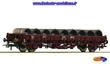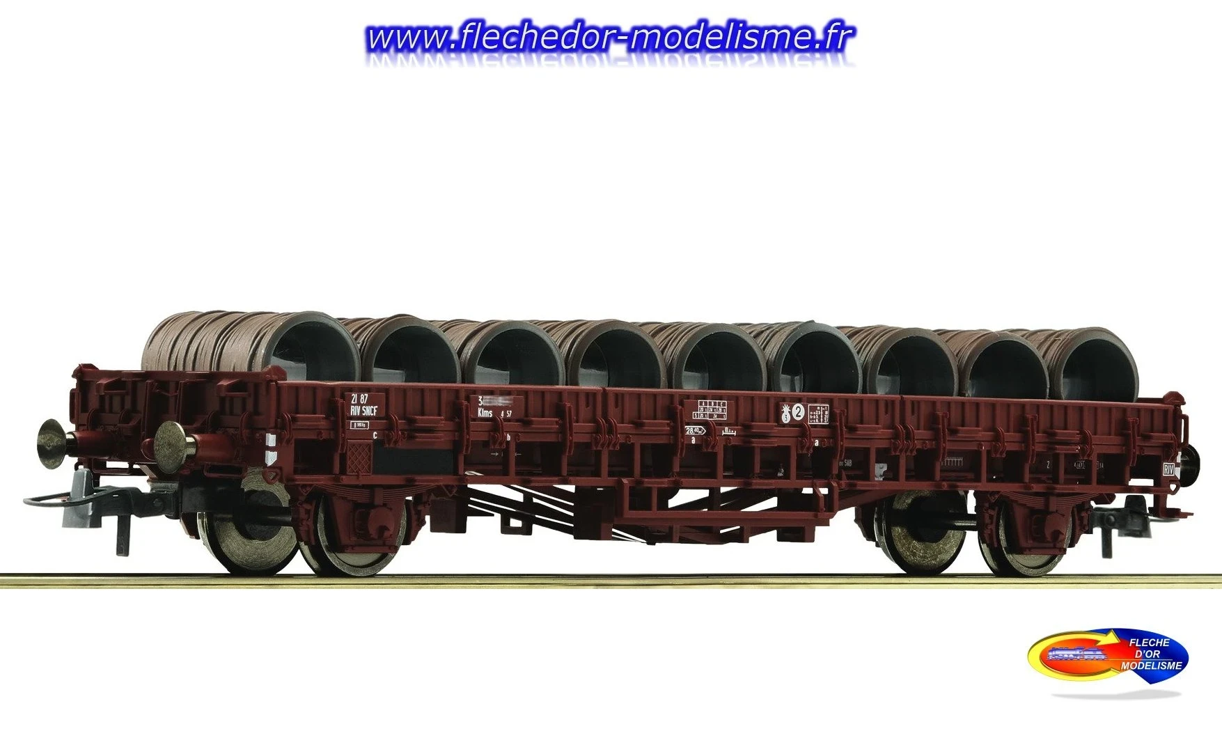 Wagon plat, type Klms, SNCF - Ep.IV - proposé par ROCO. Chargé de bobines de fil métallique. Boîtier d'attelage selon NEM 362 avec cinématique d'attelage court. Longueur tampons compris : 139 mm.
